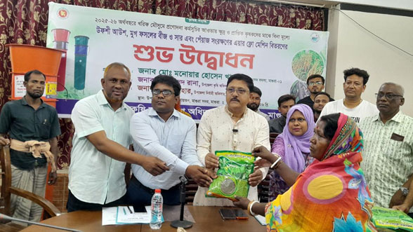 Under the Kharif seasonal incentive program for the 2025–26 fiscal year, seeds and fertilizers for high-yielding Aus rice and mung beans, along with air flow machines for onion storage, have been distributed among small and marginal farmers in Magura.