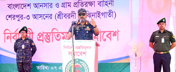Members assigned to 128 polling centres in the Sherpur-3 constituency took part in the assembly. At the same time, the event was linked live with a gathering in Bogura district through a giant screen, adding a new dimension to overall coordination, supervision and technological capability. In the elections scheduled to be held on 9 April 2026, a total of 1,704 Ansar and VDP members will be deployed at 128 polling centres in Sherpur-3, while 1,990 members will perform duties at 150 polling centres in Bogura Sadar upazila.