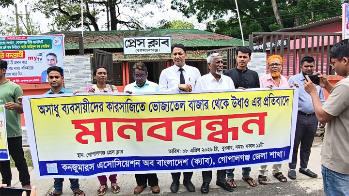 The Consumers Association of Bangladesh (CAB) has held a human chain program in Gopalganj to protest the sudden disappearance of edible oil from the market and the abnormal increase in prices due to the manipulation of some unscrupulous traders and profiteers.